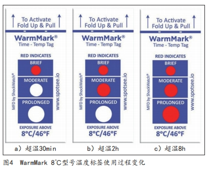 WarmMark系列溫度標簽能簡單直接地監測物品是否暴露于不合適的溫度當中,如圖3所示,通過標簽的顏色變化可以推算出暴露的時間,記錄貨物運輸時所處的溫度是否合理,且原有的不合格溫度記錄不會隨著溫度和時間的改變而改變。如果標簽暴露在它的反應溫度以上,墊片內的化學劑融化變成紅色,并且開始沿著內管往下流。WarmMark溫度標簽有3個窗口,化學劑流到每個窗口都有一定的時間,因此,窗口顯示紅色的時間是可以推算出來的,當溫度低于反應溫度,化學劑的移動停止。WarmMark溫度標簽的精確度確保在反應溫度的±1℃內。以WarmMark系列溫度標簽8℃這一型號為例,如圖4所示,超溫后變色可推算超溫時間,當超溫達到 30min,第一個窗口變紅色;當超溫達到2h,第二個窗口變紅色;當超溫達到8h,第三個窗口變紅色。