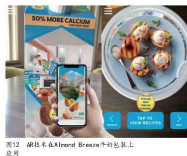 澳大利亞公司TomKat開發的KoolPak包裝系統,可以讓運輸海產品的聚苯乙烯箱重復使用,減少對環境的污染,如圖11所示。使用時,客戶在智能手機上下載KoolPak應用程序,將手機貼近箱體進行配置,配置完成后,NFC溫度傳感器標簽開始監測和記錄箱體內的溫濕度數據。 (4)AR技術 現實增強技術,也就是我們常說的AR,是一種實時地計算攝影機影像的位置及角度并加上相應圖像的技術,其目標是在屏幕上把虛擬世界套在現實世界并進行互動。在信息化背景下,將AR技術應用在包裝設計上,可以解決目前包裝產品上信息有限、傳遞方式單一的問題,同時還能增強包裝的展示效果,增加人和包裝之間的互動體驗。