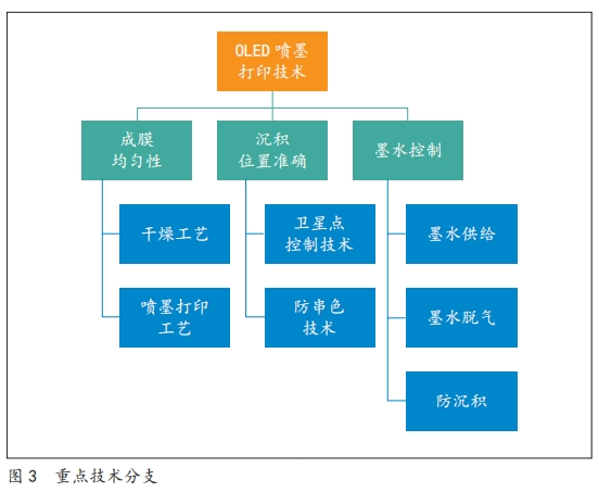 重點技術分析 通過對 OLED 噴墨打印技術專利文獻的收集、標引和梳理,對涉及到的 OLED 噴墨打印的專利文獻樣本進行分析后發現,目前 OLED 噴墨打印技術的研究重點主要包括以下幾個方面:成膜均勻性、沉積位置準確性以及墨水供給技術(如圖 3 所示)。