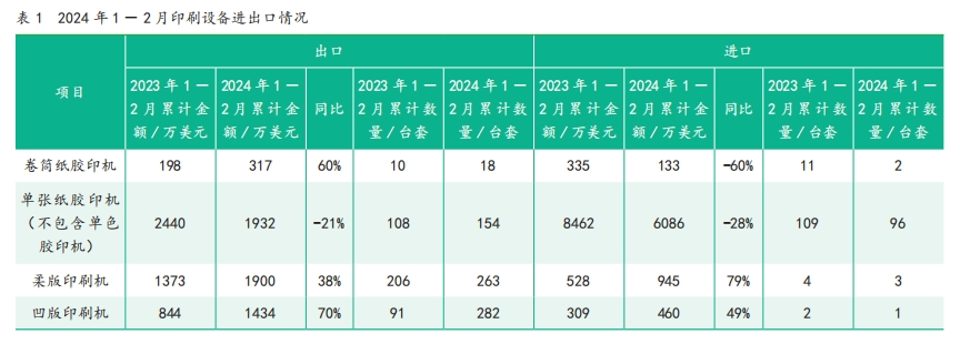 2024 年 1—2 月,印刷設備進出口方面 1)單張紙膠印機的進、出口金額均有 20% 以上的下降; 2)柔性印刷版印刷機、凹版印刷機的進出口金額均有大幅增長,最少的也有38%; 3)卷筒紙膠印機出口金額同比增長 60%,增長幅度較大; 2.