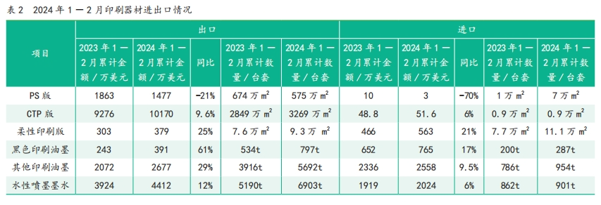 (1)版材 1)PS 版 2024年1—2月,出口PS版575萬m2 ,金額1477萬美元,金額同比下降 21%。2023 年同期出口PS版674萬m2 ,金額 1863萬美元。與出口 PS 版相比,PS版進口數量和金額均較少。 2)CTP 版 2024年1—2月,出口CTP版3269萬m2,金額1億美元,金額同比增長9.6%。 2024年1—2月,進口CTP版1萬m2, 金額 52萬美元。 3)柔性印刷版 2024年1—2月,進口柔性印刷版11萬m2,金額 563萬美元。進口柔性印刷版主要來自發達國家。進口數量最多的來源國是德國和日本,兩國進口數量相加為 9.2萬m2,占總進口數量的83%。 2024年1—2月, 累計出口柔性印刷版9萬m2,金額379萬美元,金額同比增長25%。 (2)油墨 1)黑色印刷油墨 2024年 1—2月,進口黑色油墨287t,金額765萬美元,金額同比增長17%。其中,從日本進口數量最多,為119t,金額347萬美元,數量約占總進口量的 41%,其次分別為英國、韓國、法國、新加坡和德國。 2024年1—2月,出口黑色油墨797t,金額391萬美元,金額同比增長61%。 2)其他印刷油墨 2024年1—2月,進口其他印刷油墨954t,金額2558萬美元,金額同比增長10%。進口數量最大的來源國為日本,244t,占總進口數量的25%,金額951萬美元,占總進口金額的37%。從韓國進口212t,524萬美元,金額排名第二。 2024年1—2月,出口其他印刷油墨3916t,2072萬美元,金額同比增長29%。 (3)水性噴墨墨水 2024年1—2月,出口水性噴墨墨水6903t,金額4412萬美元,金額同比增長12%。 2024年1—2月,進口水性噴墨墨水901t,金額2024萬美元,金額同比增長6%。其中,從馬來西亞進口最多,300t,金額 1027萬美元,占總進口金額的一半;其次是日本,170t,金額 328萬美元。 3. 印刷品 2024年1—2 月印刷品進出口數據如表 3所示。