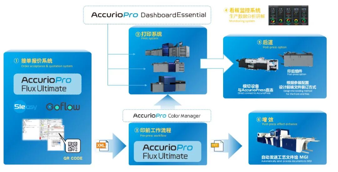 同時,柯尼卡美能達(dá)與好利用首次強(qiáng)強(qiáng)聯(lián)合,首次推出創(chuàng)新的連線解決方案,完美實(shí)現(xiàn)按需生產(chǎn)工作流程。該方案通過數(shù)字化整合印刷和印后環(huán)節(jié),構(gòu)建了完整的生產(chǎn)體系:從AccurioPro Flux Ultimate接單報(bào)價(jià)系統(tǒng)開始,經(jīng)AccurioPro Flux Ultimate印前工作流程,到打印系統(tǒng),配合生產(chǎn)數(shù)據(jù)分析看板監(jiān)控系統(tǒng),最終完成增效處理,形成端到端的智能化生產(chǎn)閉環(huán)。“這也是基于我們對中國印刷企業(yè)的理解而推出的解決方案,能夠解決他們目前面臨的一些問題,縮短不同工序之間的周轉(zhuǎn)時間,提升生產(chǎn)效率。”李剛總結(jié)說道。