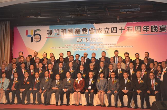 中國澳門印刷業商會45周年慶祝晚宴合影 當日晚,中國澳門印刷業商會慶祝成立45周年聯歡晚宴在萬豪軒隆重舉行。在這個值得紀念的日子,兩岸印刷界同仁與中國澳門印刷業商會互贈禮品,舉杯同慶,共同祝愿商會在新時期、新起點之上,為深入推動兩岸印刷業的發展,推動行業轉型升級做出更大的貢獻。