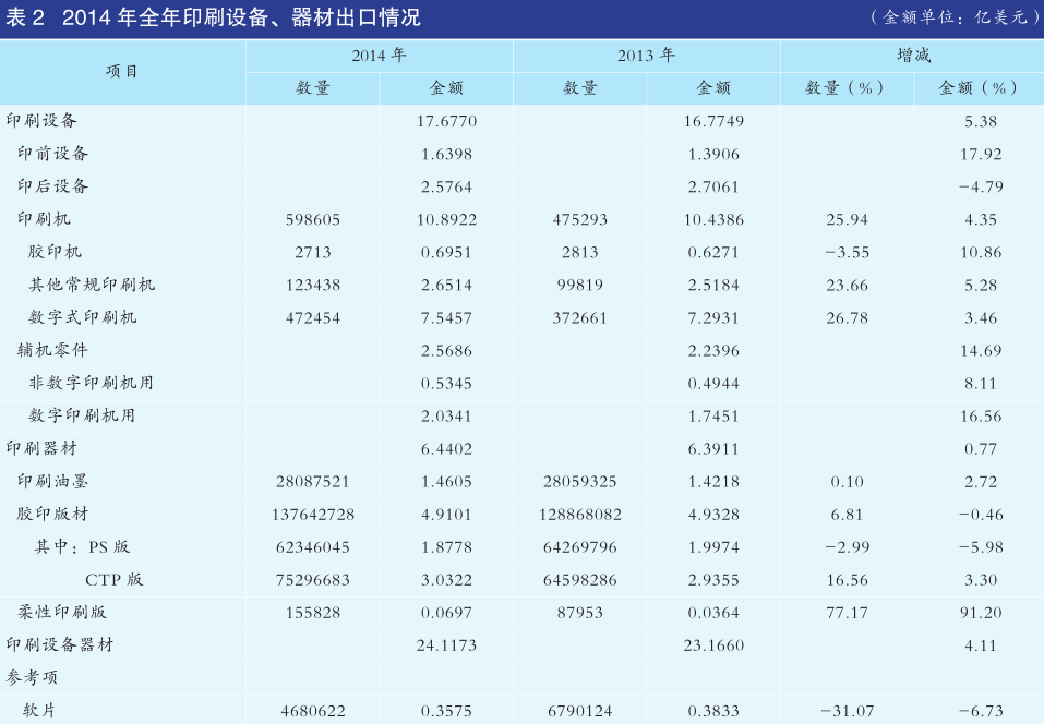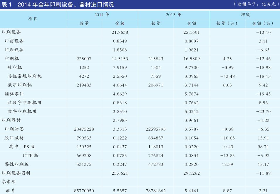 發表時間:2016-08-19 13:01 2014年全年印刷設備進出口49.7794億美元,較上年下滑4.81%。其中進口25. 6621億美元,較上年下滑11.89%;出口24.1173億美元,較上年增長4.11%,貿易逆差1.5448億美元,屬歷年最低。 印刷設備、器材進口情況 2014年印刷設備進口21.8638億美元,同比下降13.10%(與2013年全年相比,下同)。其中,印前設備進口0.8349億美元,同比上升3.11%。印后設備進口1.8508億美元,同比下降6.63%。印刷機進口14.5153億美元,同比下降12.46%。印刷機中,膠印機進口7.9159億美元,同比下降18.98%,(數量下降3.99%);其他常規印刷機進口2.5350億美元,同比下降18.13%(數量下降43.48%);數字印刷機進口4.0644億美元,同比增長9.42%(數量增長6.05%)。輔機零件進口4.6629億美元,同比下降19.43%。輔機零件中,常規印刷機用輔機零件進口0.8318億美元,增長8.56%;數字印刷機用輔機零件進口3.8310億美元,同比下降23.70%。 2014年印刷器材進口3.7983億美元,同比下降4.23%。其中,油墨進口3.3513億美元,同比下降6.35%(數量下降9.38%)。膠印版材進口0.1222億美元,同比上升15.91%(數量下降10.65%)。膠印版材中,PS版進口0.0437億美元,同比上升98.71%(數量上升10.43%);CTP版進口0.0785億美元,同比下降5.92%(數量下降13.85%)。柔性樹脂版進口0.3247億美元,同比上升15.17%(數量上升12.39%)。 ![]() 印刷設備、器材出口情況 2014年印刷設備出口17.6770億美元,同比增長5.38%。其中,印前設備出口1.6398億美元,同比增長17.92%。印后設備出口2.5764億美元,同比下降4.79%。印刷機出口10.8921億美元,同比增長4.34%。印刷機中,膠印機出口0.6951億美元,同比增長10.86%(數量下降3.55%);其他常規印刷機出口2.6514億美元,同比增長5.28%(數量增長23.66%);數字印刷機出口7.5457億美元,同比增長3.46%(數量增長26.78%)。輔機零件出口2.5686億美元,同比增長14.69%。輔機零件中,常規印刷機用輔機零件出口0.5345億美元,同比增長8.11%;數字印刷機用輔機零件出口2.0341億美元,同比增長16.56%。 2014年印刷器材出口6.4402億美元,同比增長0.77%。其中,印刷油墨出口1.4605億美元,同比增長2.72%(數量增長0.10%)。膠印版材出口4.9101億美元,同比下降0.46%(數量增長6.81%)。膠印版材中,PS版出口1.8778億美元,同比下降5.98%(數量下降2.99%);CTP版出口3.0322億美元,同比增長3.30%(數量增長16.56%)。柔性樹脂版出口0.0697億美元,同比增長91.20%(數量增長77.17%)。 ![]() 值得關注的“動向” 印刷設備、器材進出口金額方面,進口繼續下滑、出口持續上升。印刷設備出口金額以較大優勢領先于印刷器材出口;膠印機進口金額已經連續三年下滑,2014年下滑幅度更達到19%;數字印刷機進出口金額 實現雙增長。從器材出口來看,2014年印刷油墨出口數量繼續超過進口;膠印版材出口數量增加、金額下滑,CTP版出口數量繼續超過PS版,幅度較上一年有所擴大;柔性樹脂版出口持續大幅度增加。 |
