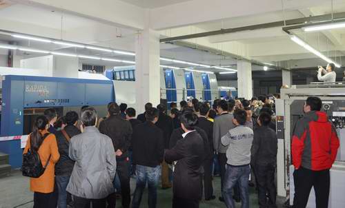 研討會結(jié)束之后,與會嘉賓還前往武漢玲瓏清風(fēng)印務(wù)有限公司進行參觀,觀看了高寶利必達(dá)145-4 SPC印刷機的現(xiàn)場演示,許多用戶在現(xiàn)場真實記錄了快速換版的過程,演示現(xiàn)場進行了四套換版,每個活件印制了200張成品,總用時僅不到20分鐘!這么快速而高效的印刷令所有人驚嘆不已!高寶大幅面之于合版印刷無疑是最合適的印刷設(shè)備!