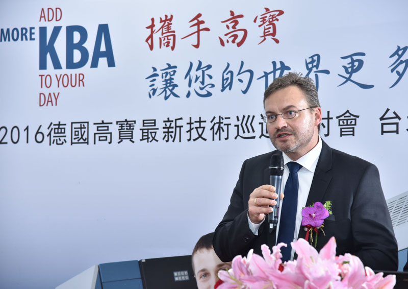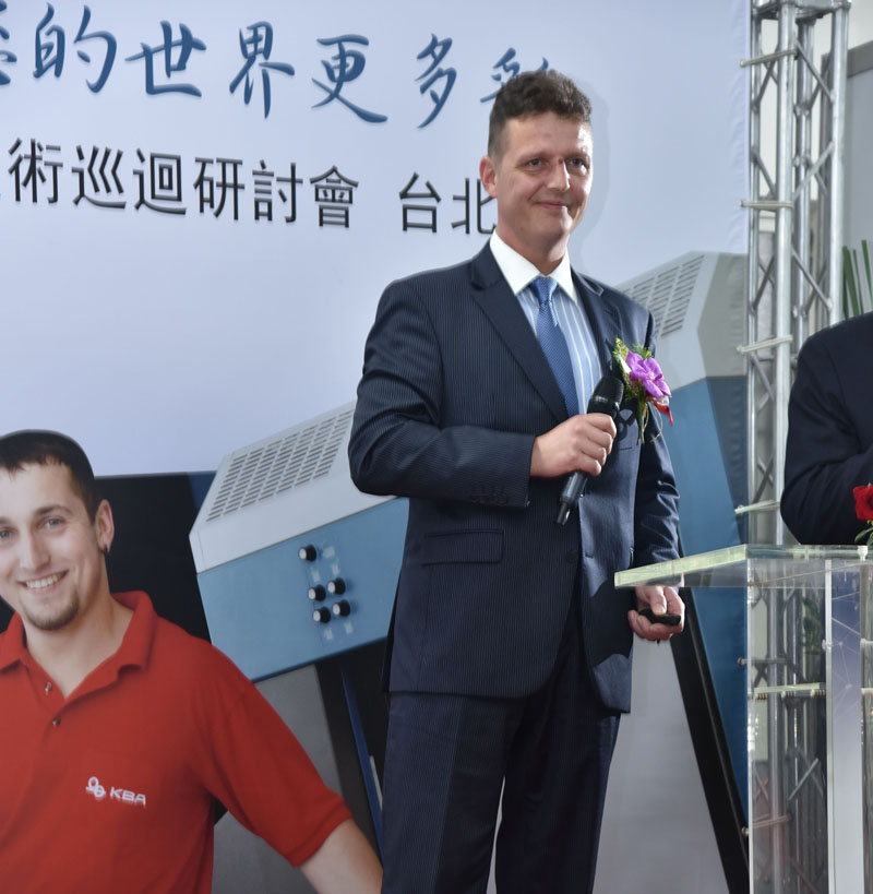 圖8:德國高寶集團單張部產(chǎn)品管理及大客戶部總監(jiān)Sacha Fischer先生進行技術演講 Sacha Fischer先生在演講中表示,由于市場需求多變,終端客戶對產(chǎn)品的需求更加少量化與多樣化,現(xiàn)在全球印刷市場的確面臨一些挑戰(zhàn),但印刷廠選用高配置設備,可讓前置時間整體大幅縮短,同時增加更多產(chǎn)能,相對提升客戶更多獲利能力。為此,高寶將印刷準備和印刷速度的雙料“世界冠軍”——利必達106系列確定為今年在中國臺灣市場的主推機種,以滿足中國臺灣優(yōu)質客戶的需求。