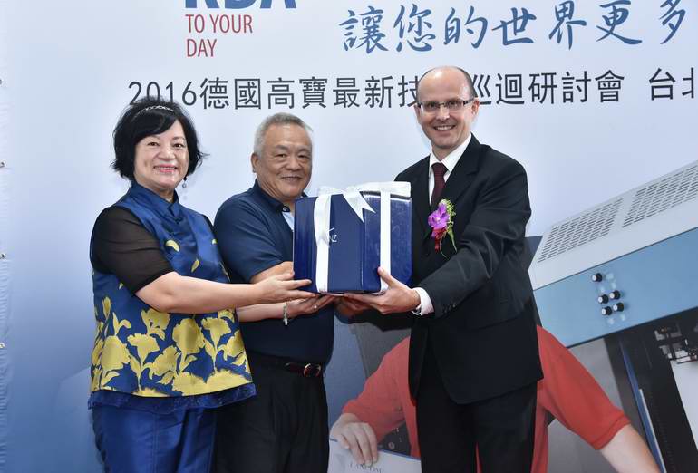 圖1: 2016德國高寶最新技術巡回研討會中國臺灣站在富綱實業(yè)股份有限公司舉行 會議現(xiàn)場,富綱實業(yè)股份有限公司董事長賴金盛、中國臺灣區(qū)印刷暨機械材料公會總干事陳銘基、印刷人雜志總社長陳政雄、高寶大中華區(qū)首席執(zhí)行官岑寒等嘉賓紛紛出席活動并致辭。 據(jù)中國臺灣高寶印刷機械有限公司總經(jīng)理彭柏東先生介紹,近年來,高寶在中國臺灣地區(qū)發(fā)展持續(xù)向好,特別是在包裝市場應用方面的知名度和市場占有率不斷提升,尤其在近兩年“中國臺灣高寶印刷機械有限公司”正式成立后,發(fā)展更為迅速。正是在此良好勢頭上,高寶在臺灣新印刷機市場上,更可望持續(xù)擴大客戶群體,贏得領軍地位。