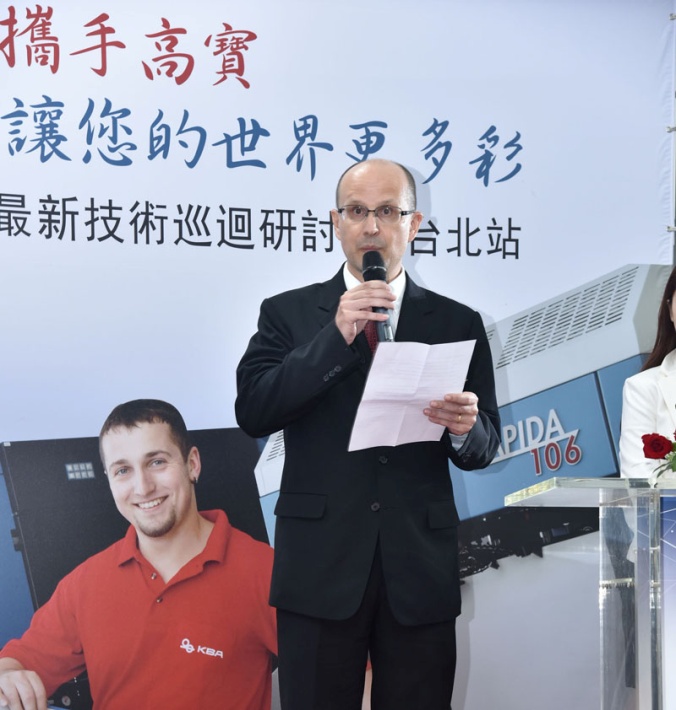 圖7:德國高寶集團單張部銷售經(jīng)理Stefan Schmidt先生 熟悉高寶品牌運作的印刷人都知道,與一般的行業(yè)巡展不同,高寶每年的全國巡展都采取因地制宜的方法,即面向不同市場客戶需求、不同地區(qū)印刷發(fā)展狀況,展示不同的研討會內容。而本次中國臺灣一站的探討,就著重體現(xiàn)出了高寶在包裝印刷市場的領軍地位和尖端技術應用。