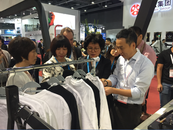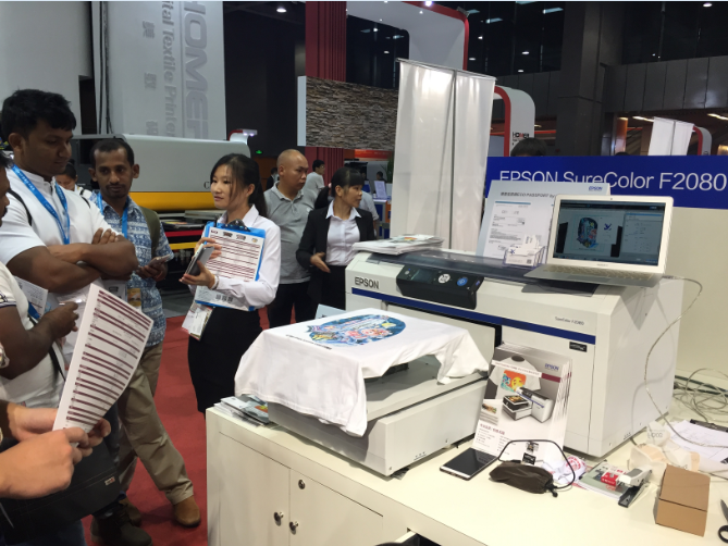 (Epson SureColor F2080平臺式專業數碼印花機) 此外,展會現場展示的個性化T恤打印均由愛普生Epson SureColor F2080平臺式專業數碼印花機印制而成,便捷的操作、個性化的設計吸引了很多觀眾前來體驗。F2080可以實現一對一的個性化定制,為印花廠商、淘寶店和DIY禮品實體店等提供了適應個性化短版印制要求的解決方案,帶來了直接面向個人消費市場的機遇。該設備無需制版,直接將電腦中的圖像打印即可,打印一件T恤用時僅需2分鐘左右,非常省時;其使用原裝“活的色彩DG”涂料墨水,兩種墨水配置,滿足不同用戶需求,輸出色彩鮮艷,印刷出的圖像極具感染力,其承印物也通過了Oeko-tex Standard 100 的第一級別認證和ECO PASSPORT by OEKO-TEX?認證,達到了綠色環保的要求,有效的實現了客戶與用戶的雙重安全保證。