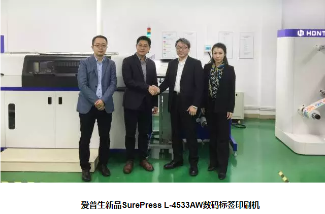 隨后,梁堅經理分享了愛普生在數碼行業的歷程和貢獻。愛普生始終本著“挑戰與創新”理念,秉承“科技+本地化”戰略,立足中國市場,為用戶提供創新高效的產品和解決方案。接下來,愛普生(中國)內田康彥、袁雪、梁堅和廣州鴻運總經理趙勁豪共同發布愛普生新品SurePress L-4533AW數碼標簽印刷機,正式揭開新品面紗。